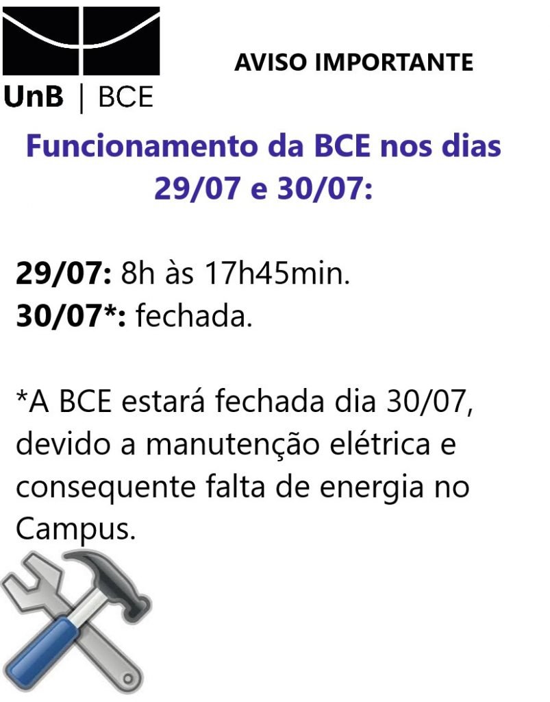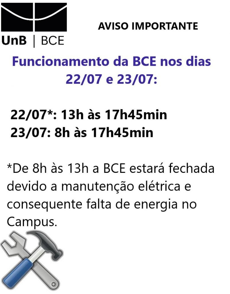 Horário de funcionamento da BCE neste fim de semana! Sábado (08 de julho): das 08h às 13h* Domingo (09 de julho): das 08h às 17:45h *Sábado à tarde a Biblioteca estará fechada para limpeza mensal.