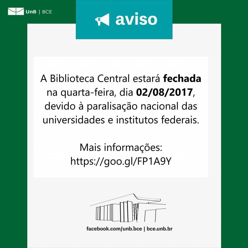 Prezados Usuários, em razão da Paralisação Nacional, informamos que a BCE estará fechada amanhã – 30/06/2017. http://atens-sn.org.br/?noticias=atens-consulta-filiados-e-decide-aderir-a-greve-geral-de-30-de-junho www.sintfub.org.br/2017/06/trabalhadores-se-unem-favor-da-greve-geral-e-contra-demissoes-e-reformas Agradecemos a compreensão, BCE.